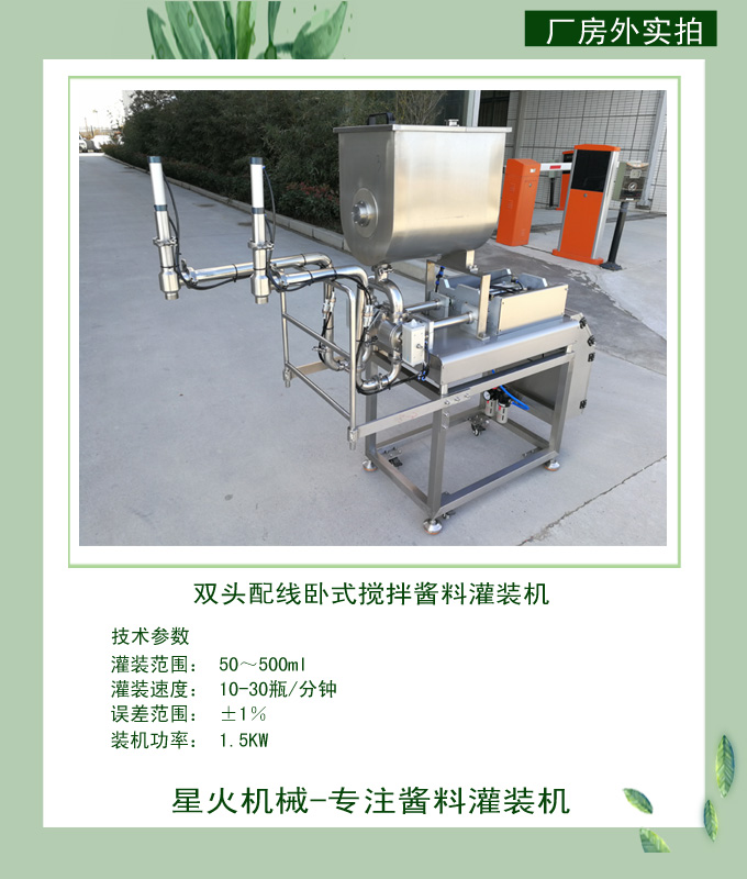 雙頭配線臥式攪拌醬料灌裝機主要是針對粘稠并帶有顆粒且濃度較大的醬狀物料灌裝而設(shè)計的,如蘑菇醬、火鍋底料、香菇醬、豆瓣醬、鮮辣醬等灌裝的臥式攪拌醬料灌裝機,臥式攪拌,確保醬和油的充分混合,灌裝物料更均勻,結(jié)構(gòu)簡單、精確度高、操作簡便。