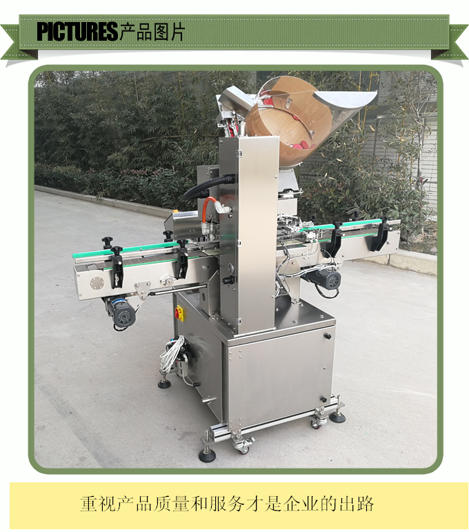 自動(dòng)真空旋蓋機(jī)機(jī)是我司多名具有豐富經(jīng)驗(yàn)的高級(jí)工程師研發(fā),集自動(dòng)理蓋、上蓋、自動(dòng)抽真空旋蓋于一體,手用真空泵抽真空的方式,可獲得很高的真空度。具有無(wú)瓶不送蓋,缺蓋自動(dòng)報(bào)警功能,自動(dòng)化程度高,主要?dú)鈩?dòng)及電器元件采用國(guó)際知名品牌,性能穩(wěn)定可靠,廣泛適用于食品罐頭、飲料、調(diào)味品、保健品等行業(yè)中玻璃瓶、馬口鐵蓋的真空旋蓋。