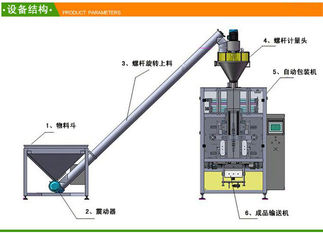 接通電源將溫度設(shè)置恒溫→設(shè)置包裝機(jī)參數(shù)(制袋尺寸及包裝重量)→人工上料到儲(chǔ)料斗振動(dòng)下料至螺桿提升機(jī)→螺桿計(jì)量器→包裝機(jī)→打印生產(chǎn)日期→制袋→充填物料→充氣→封合包裝→切斷→包裝成品輸出全過程;