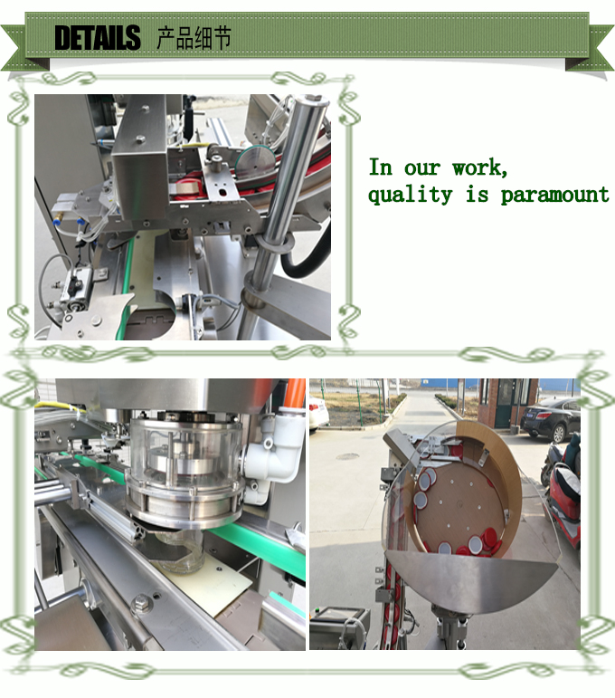 自動(dòng)真空旋蓋機(jī)機(jī)是我司多名具有豐富經(jīng)驗(yàn)的高級(jí)工程師研發(fā),集自動(dòng)理蓋、上蓋、自動(dòng)抽真空旋蓋于一體,手用真空泵抽真空的方式,可獲得很高的真空度。具有無(wú)瓶不送蓋,缺蓋自動(dòng)報(bào)警功能,自動(dòng)化程度高,主要?dú)鈩?dòng)及電器元件采用國(guó)際知名品牌,性能穩(wěn)定可靠,廣泛適用于食品罐頭、飲料、調(diào)味品、保健品等行業(yè)中玻璃瓶、馬口鐵蓋的真空旋蓋。